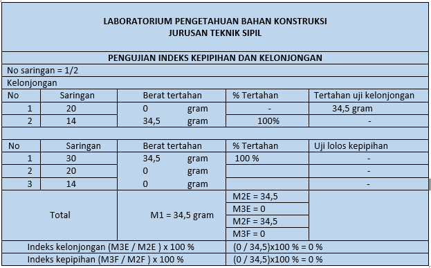 Itulah laporan Pengujian Indeks Kepipihan dan Kelonjongan Agregat. Laporan praktikum diatas didapatkan dari data praktikum yang sebenarnya. Bagi kalian yang membutuhkan bisa dijadikan bahan referensi bentuk laporan praktikum ini.
